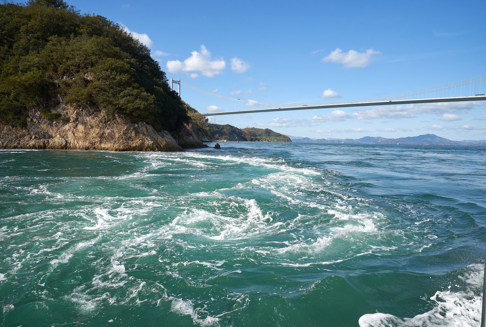 愛媛県松山・道後温泉を出発したバスは、今治市からしまなみ海道に入ります。途中の大島ではかつて「日本最大の海賊」と呼ばれた村上水軍の本拠地である能島のまわりを流れる、最大10ノット(時速18キロ)の潮流をかき分けるクルージングにご参加いただき、「天然の要塞」とも呼ばれた潮流を体験していただけます。海に滝ができたような流れの中、水しぶきをあげて船を走らせる潮流体験で自然の力を間近で感じていただけます。